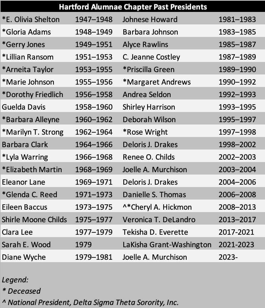 On June 14, 1947, thirteen visionary women came together to charter Hartford Alumnae, an Eastern Region Chapter. Today our membership includes more than 100 professional women in Education, Government, Corporate America, and the nonprofit sector.